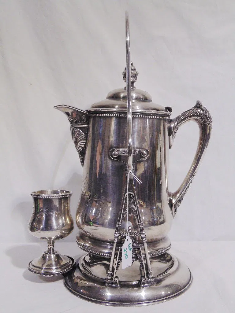 Victorian Silver Plate Tea Kettle & Stand, w/ Cup.Made by Superior Silver Co..Kettle is 12 1/2″ tall,10 1/2″ from spout to handle,overall height is 17 1/2″ tall.Kettle stand has tray for cup and cup is 5″ tall.