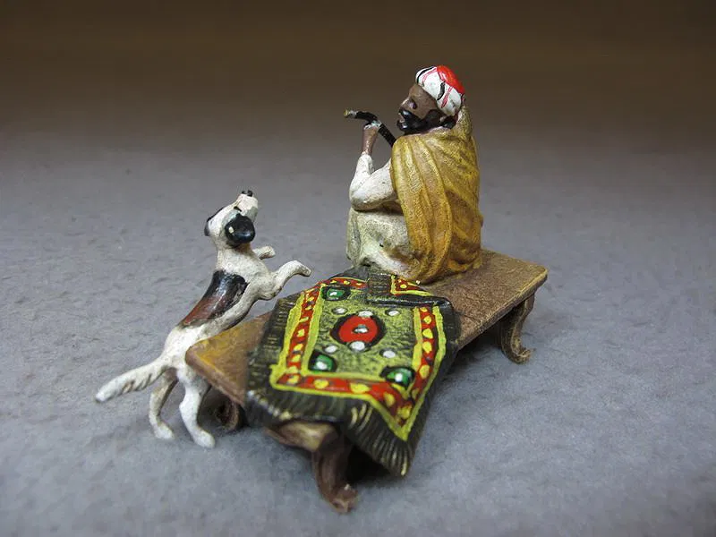 Vienna bronze Orientalist man & dog sculpture, original painting. 2” H x 2 3/4” W.
