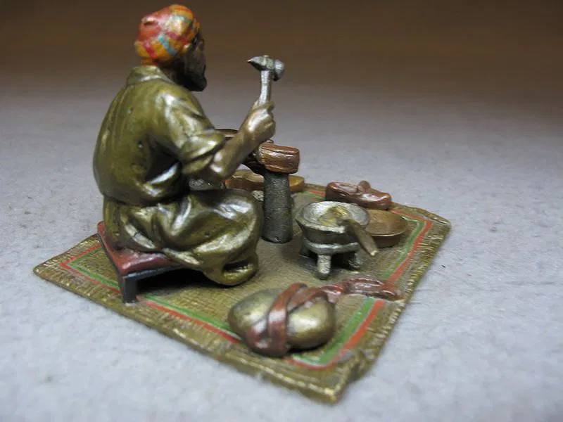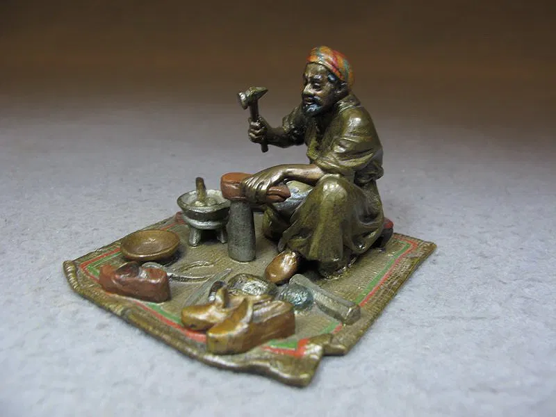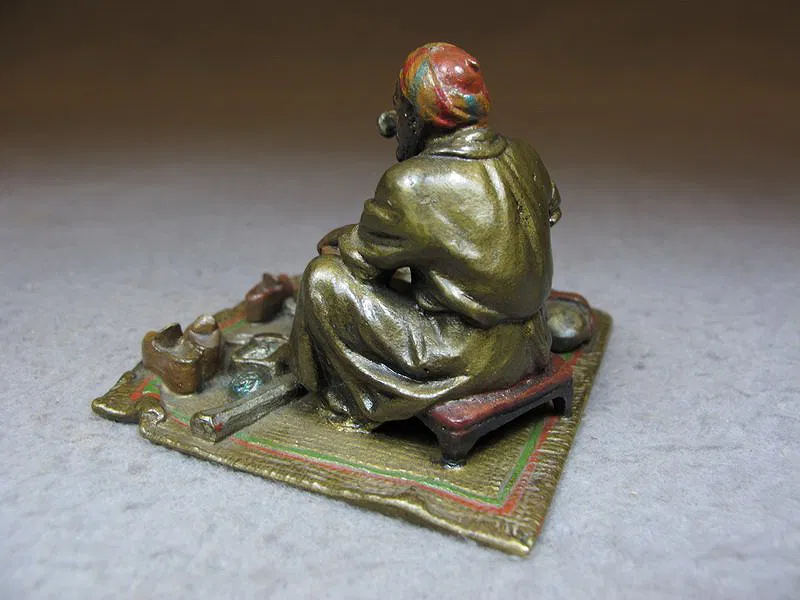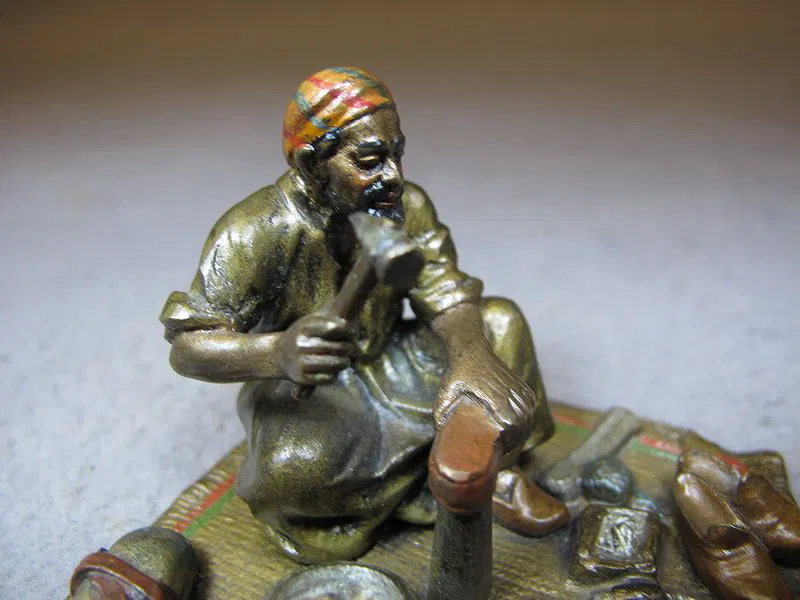 Vienna bronze Orientalist shoemaker sculpture, original painting. 2” H x 2 5/8” W x 2 3/4” D.