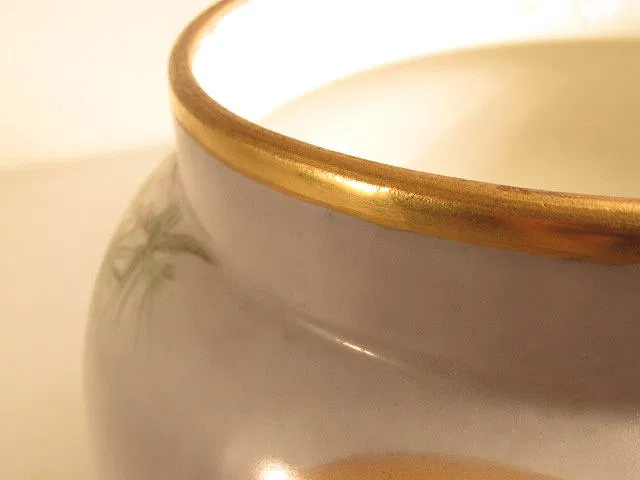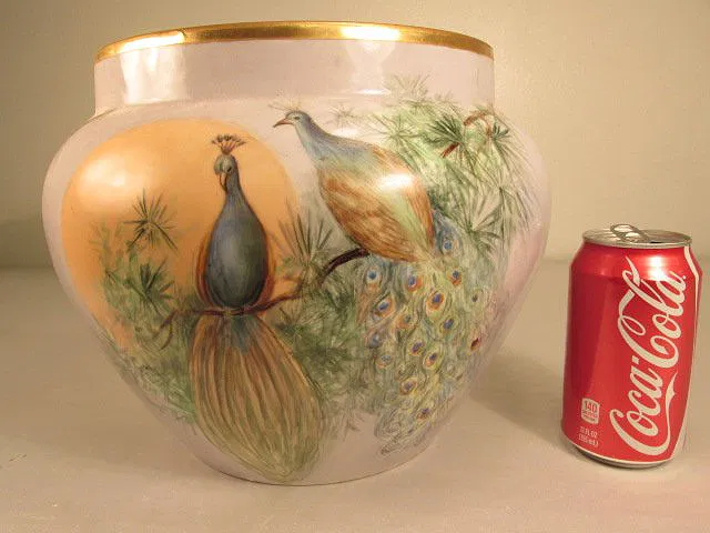 “Large Limoges Vignaud porcelain planter or pot featuring hand-painted peacock scenes. Marked on the base ‘Limoges Vignaud’. Excellent condition with very minor wear to the paint in some areas, no chips or cracks. Dimensions: 22.2 cm tall × 27.9 cm wide. Shipping weight: 6.8 lbs.”