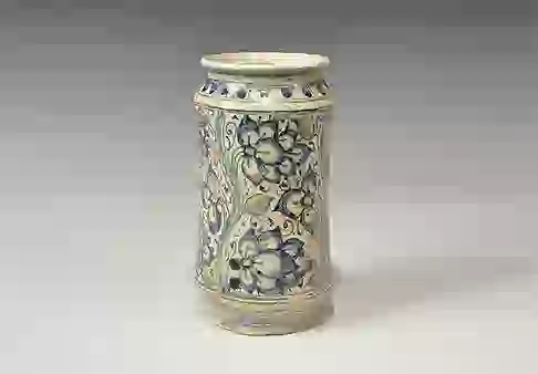 20th century AD. A white-glazed jar of waisted profile with a band of blue floral motifs to the body, segmented shoulder with yellow bands; everted rim. 800 grams, 21cm (8 1/4″). Property of a West London gentleman; acquired between 1980-2010. TimeLine Auctions Ltd arranges printed catalogue rostrum Auctions, eAuctions and Timed Auctions where we offer antiquities, ancient artefacts / artifacts, antiques, collectibles, coins, medals and books for public sale. [No Reserve]