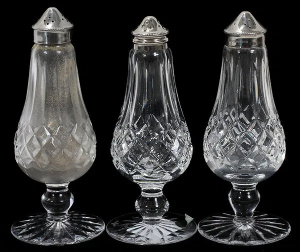 WATERFORD CRYSTAL SALT & PEPPER SHAKERS, THREE, H 6 1/4″:One chipped.