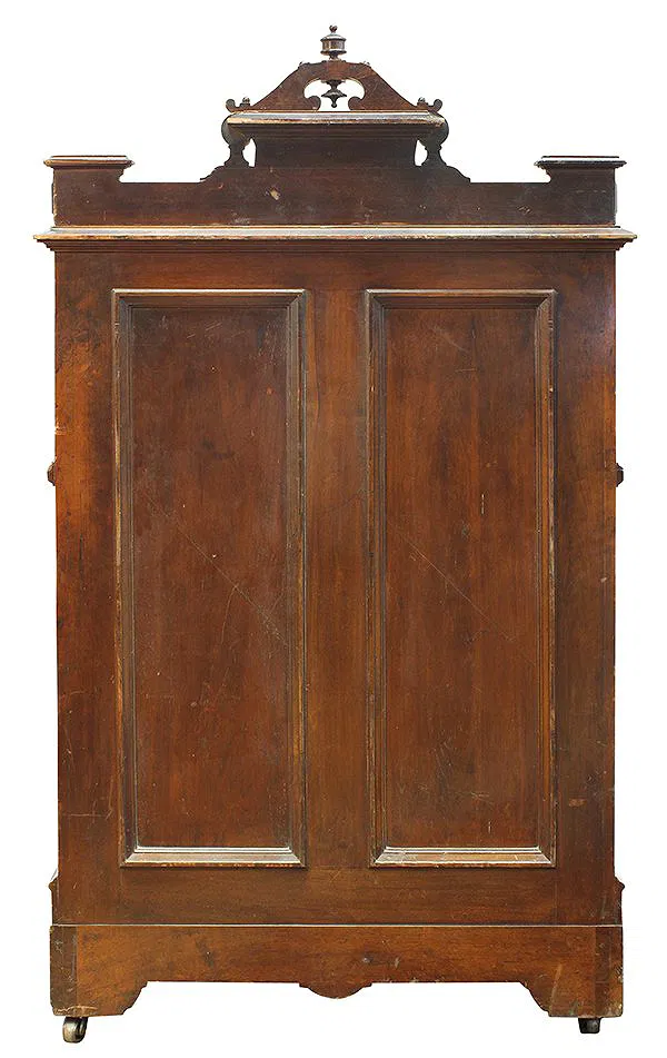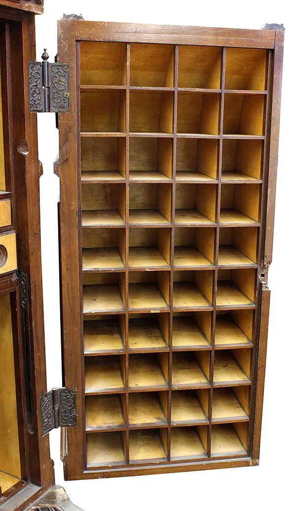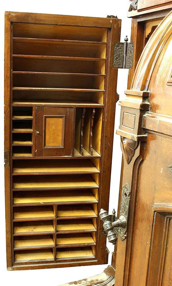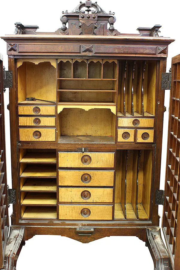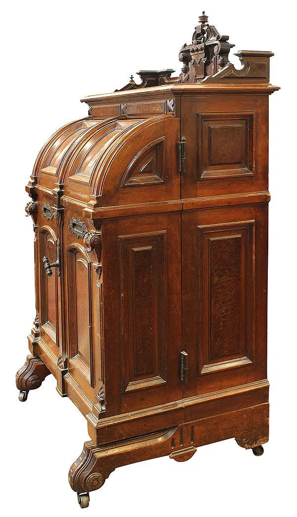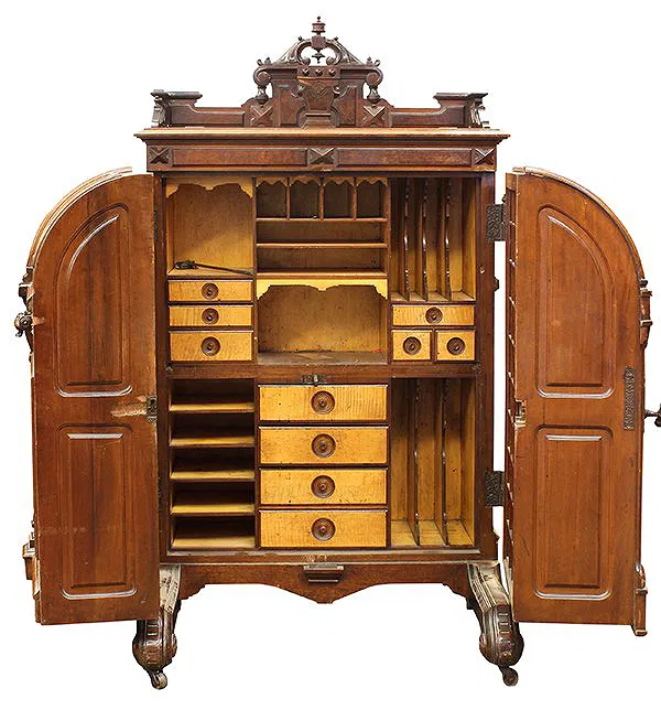American Renaissance Revival two hinge Standard Grade Wooton Patent Desk, executed in walnut and birdseye maple, circa 1874, by Wooton Desk Co., Indianapolis, Indiana, the finial capped gallery top accented with the raised burl panel, above the two door case opening to reveal the maple fitted interior, (lacking fall front), and rising on a footed base terminating on casters, 65”h x 40”w x 29”d